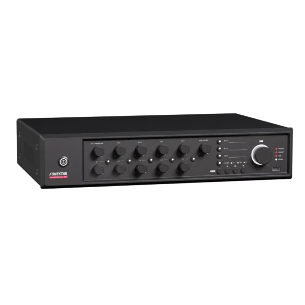 Utiliza un actual amplificador clase D de alta eficiencia y fiabilidad para ofrecer las mejores prestaciones de sonido. Consigue la sonorización de cualquier espacio durante largas jornadas.Las zonas de salida permiten seleccionar diferentes niveles de volumen, personalizando la sonorización de cada zona.Se puede enviar mensajes a zonas con micrófono de zonas.La mejor solución para instalaciones de megafonía y música ambiente con gran cantidad de altavoces de línea 100 V. También dispone de salida de baja impedancia para altavoces sin transformador.Incorpora un reproductor como fuente de música ambiente.Las entradas de micrófono permiten realizar avisos con tonos de llamada. Tienen prioridad atenuando las entradas auxiliares y activan la prioridad de atenuadores (24V) y salida de 3º hilo con prioridad.