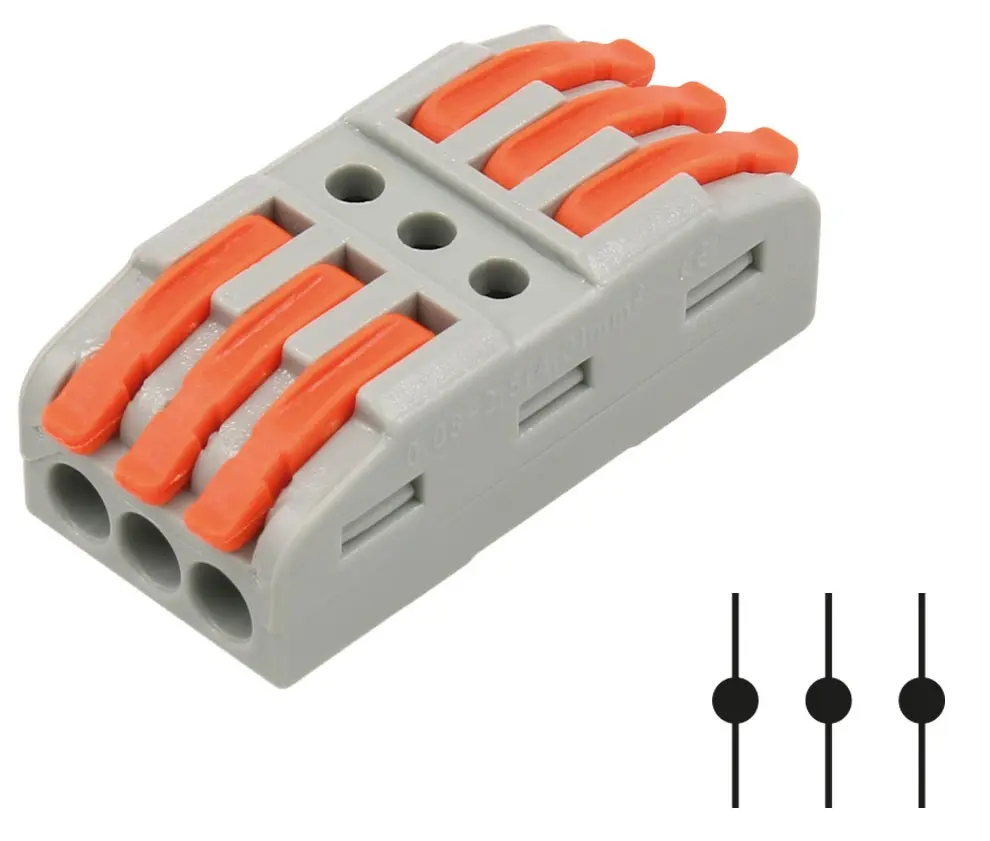 Carcasa: Policarbonato PC, palanca en Poliamida PA66Color: Gris y naranjaConductor máximo: Rígido de 0,2 a 4,0mm2, Flexible de 0,08 a 2,5mm2Contactos: Cobre niqueladoEMB: 50 / 2000Máx. Corriente: 32 Amp.Nota: Orificio de prueba de alimentaciónProducto: Conector 3 víasTemperatura de trabajo: -45ºC a 105ºCTensión nominal: 450VcaTipo: 3 ent. a 3 sal.